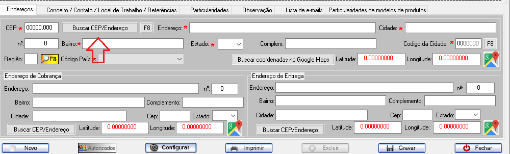 Na aba “Endereços” no cadastro de cliente, temos a opção de cadastrar 3 endereços sendo um principal, um de cobrança e um de entrega. Apenas o endereço principal (circulado em vermelho) é obrigatório.
