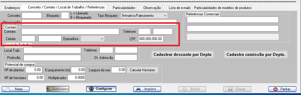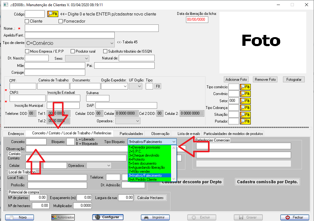 É possível determinar um conceito para o cliente como “BOM” ou “RUIM” e determinar se ele está bloqueado ou liberado para compras. Se bloqueado, é possível escolher também o motivo.