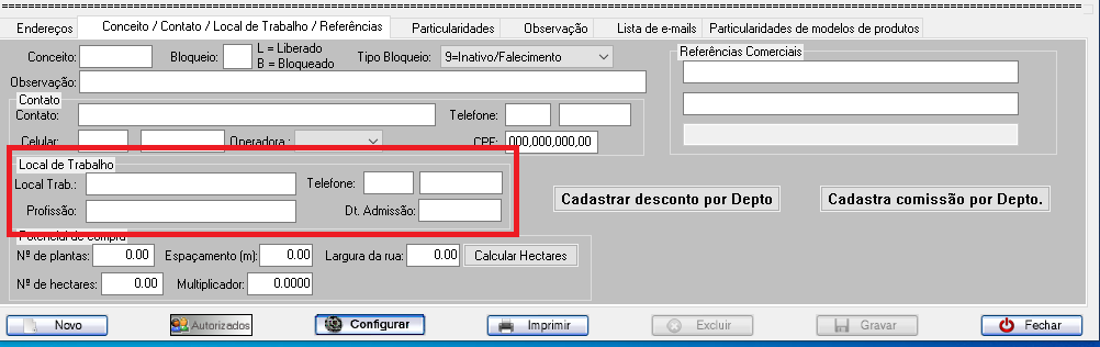 No campo local de trabalho pode-se detalhar mais sobre a profissão desse cliente, a data de admissão no emprego e o telefone de trabalho.