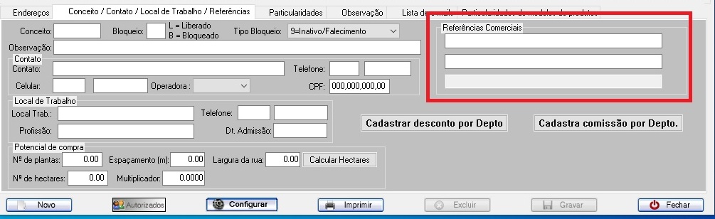 Referências comerciais do cliente podem ser cadastradas nos campos do lado direito da tela