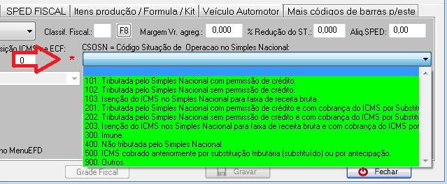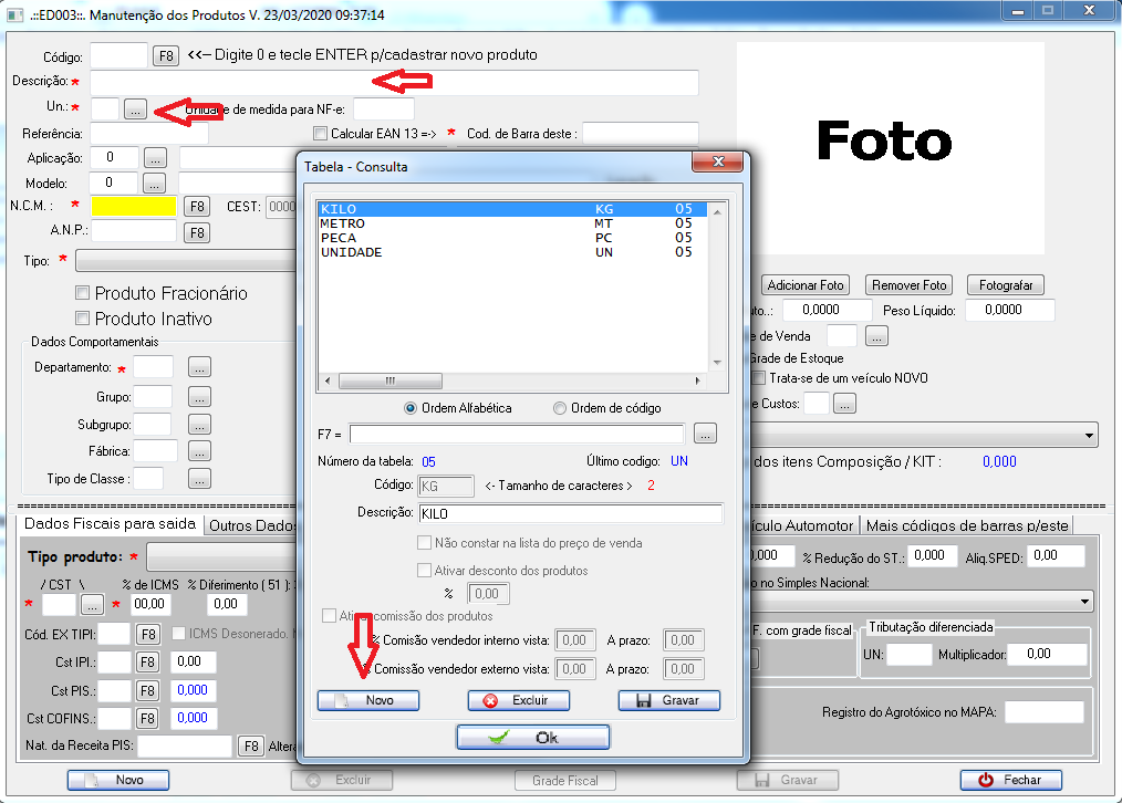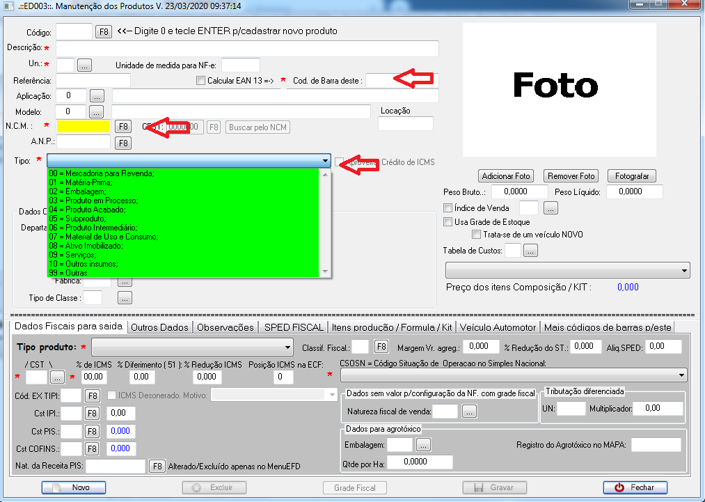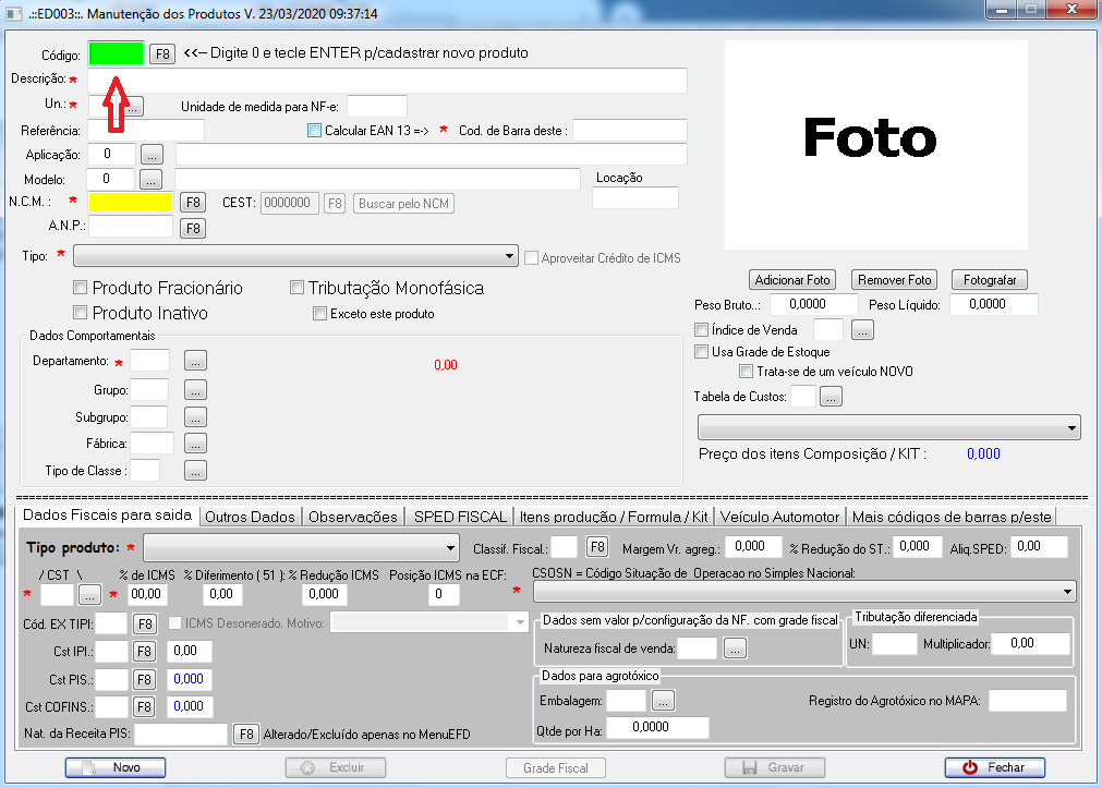 Em seguida, digite 0 no campo Código para cadastrar um novo produto.