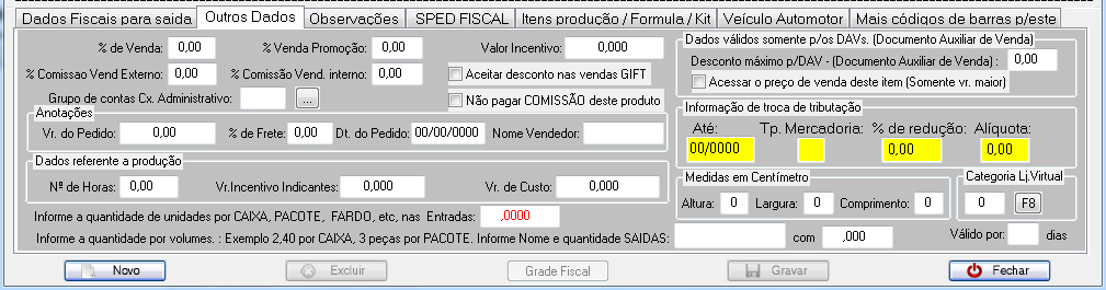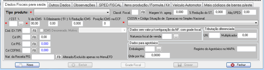 A parte inferior da tela é formada por abas. Na aba “Dados fiscais para saída” são informadas as tributações do produto. Preencha todos os campos obrigatórios marcados com asterisco (*).