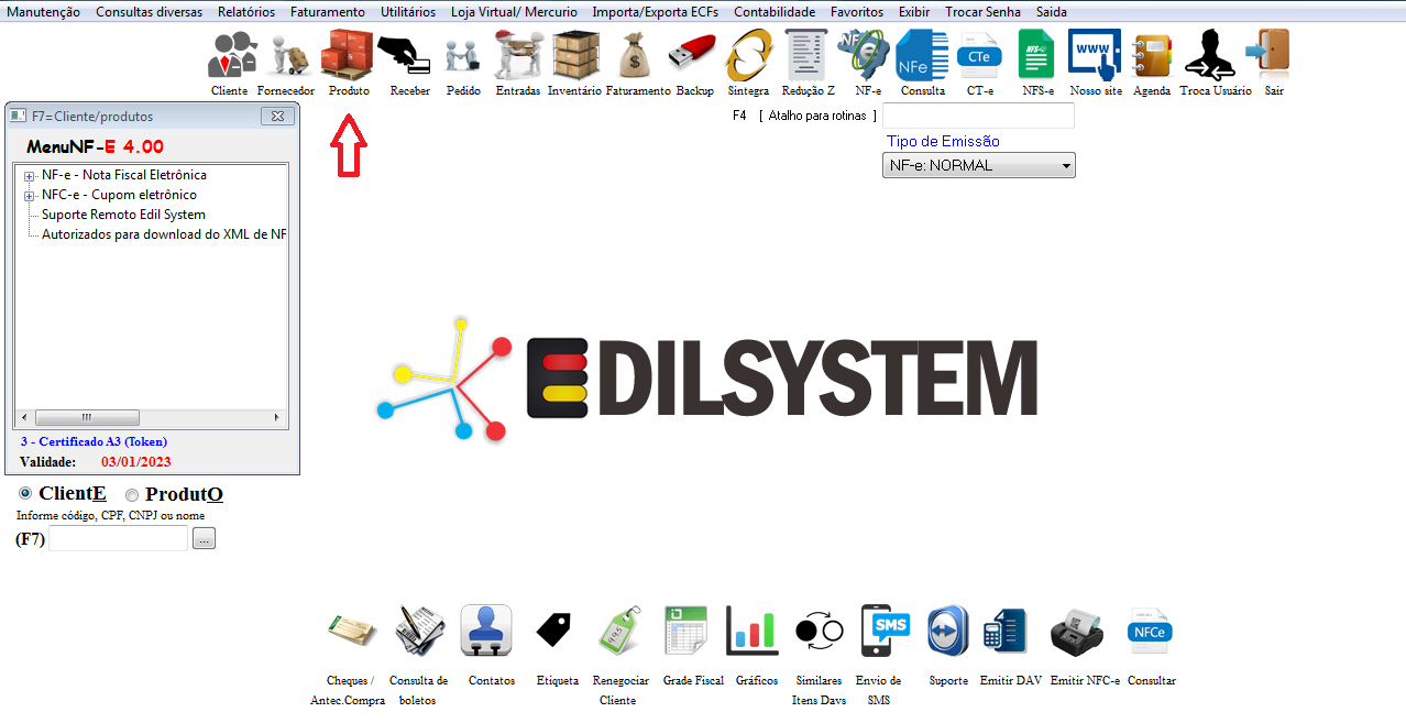 Para cadastrar um novo produto acesse o ícone com o nome Produto na tela inicial do programa.