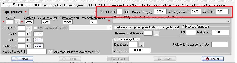 Os campos destacados na imagem abaixo são normalmente utilizados quando o tipo de empresa é uma indústria. São eles: classificação fiscal, margem de valor agregados, % redução de ST e aliquota SPED.