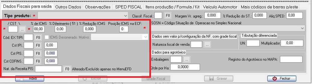 Nos dados fiscais de saída do cadastro de produtos, há alguns campos obrigatórios sinalizados com um asterisco vermelho.