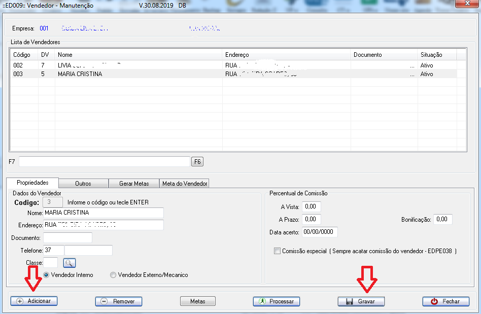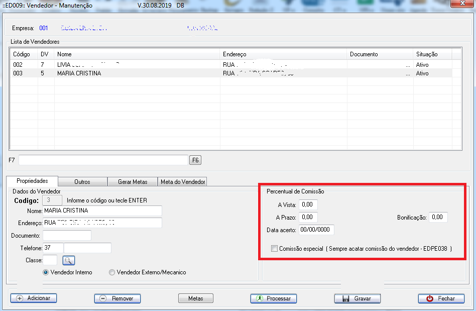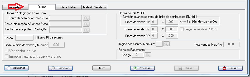 No lado direito da tela podem ser definidas as porcentagens de comissão de vendas à vista e a prazo, valores de bonificação e data de acerto desse vendedor. Essas informações não são obrigatórias.