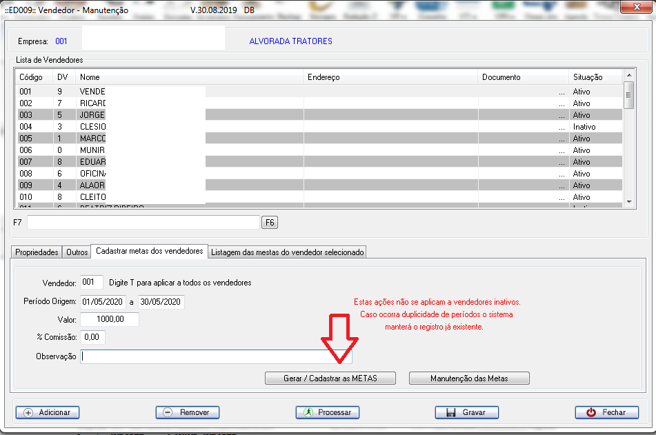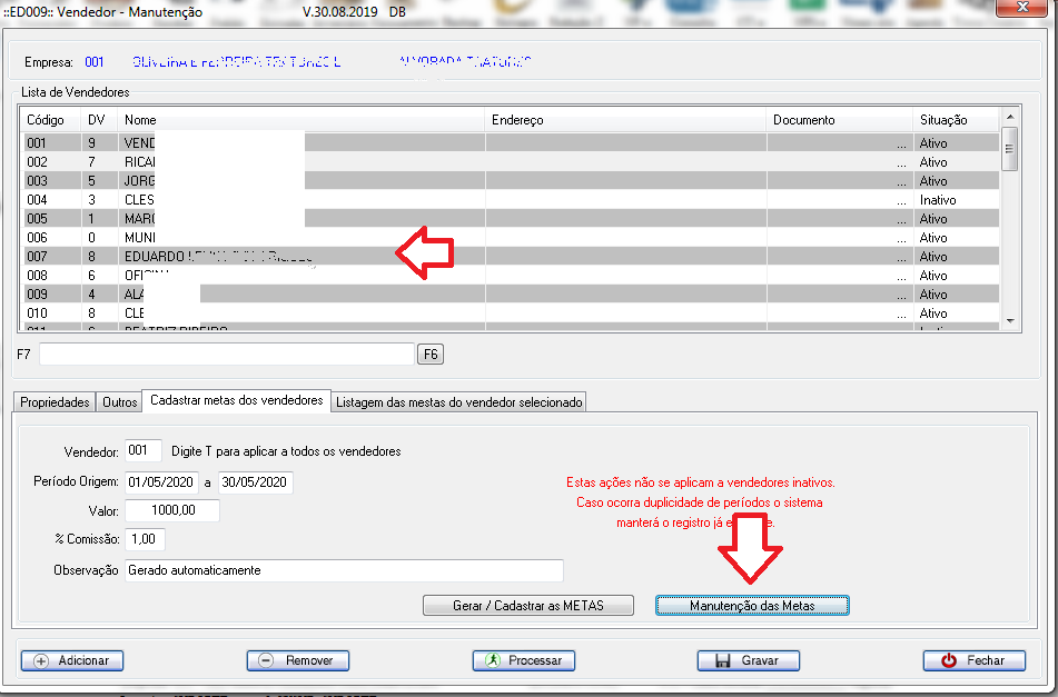 Selecione o vendedor desejado e clique na opção “Manutenção das metas”.