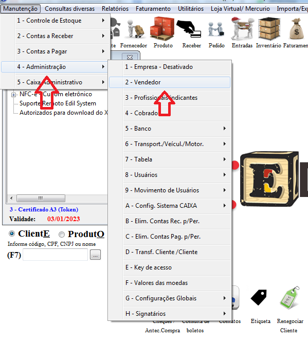 Para efetuar o Cadastro de um novo Vendedor no Sistema acessamos o ícone com o nome de Manutenção que aparece na tela inicial do programa. Em seguida, clique em 4 - Administração, 2 - Vendedor para acessar ao cadastro.
