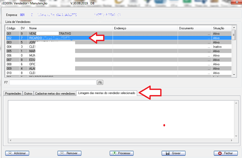 As metas de um vendedor podem ser visualizadas na aba “Listagem das metas do vendedor selecionado”. Para isso, selecione um vendedor e clique na aba.