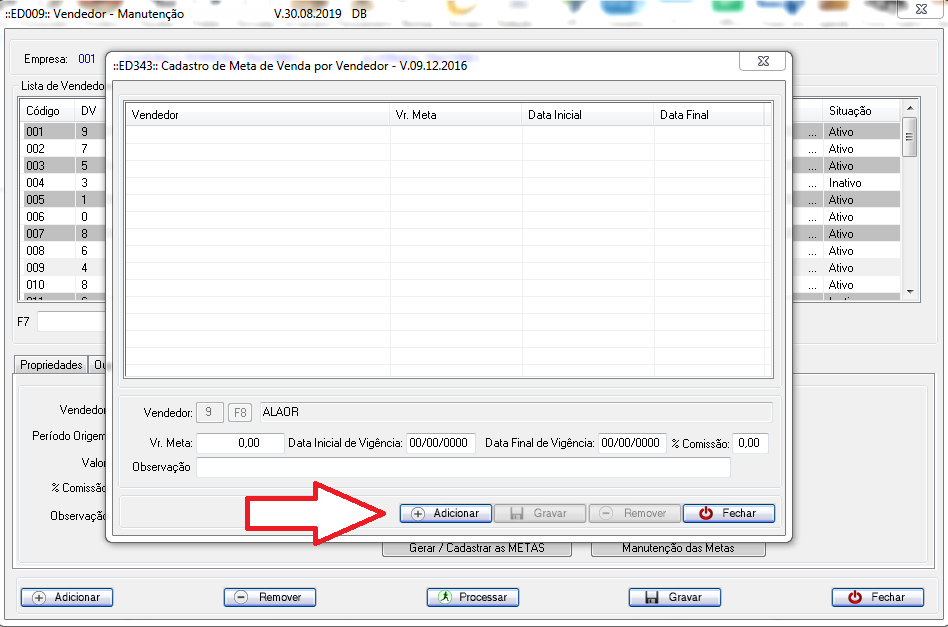Para cadastrar uma nova meta, digite o código do vendedor ou T para todos e tecle enter. Digite o período em que a meta deve ser atingida, o valor e a % de comissão. Clique em gerar para gerar a comissão.