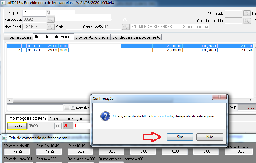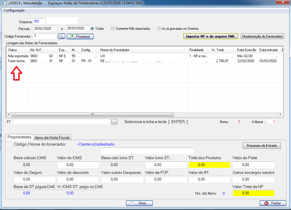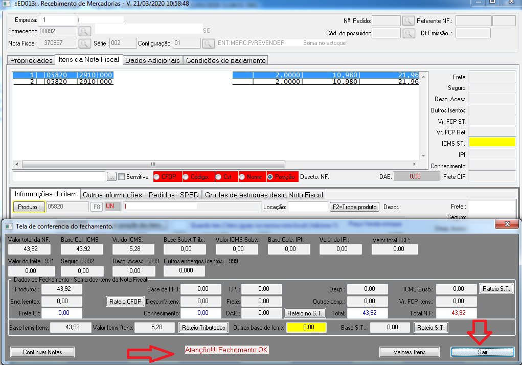 Se houver algum erro os campos errados ficarão em vermelho, sendo necessário continuar notas para verificar quais valores ficaram incorretos. Se finalizar com o Fechamento Ok basta sair como indica a seta.