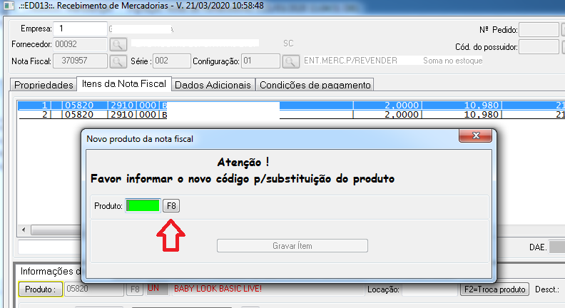Após teclar o F2 tecle o F8 para pesquisar o produto, caso não encontre o produto poderá ser cadastrado.