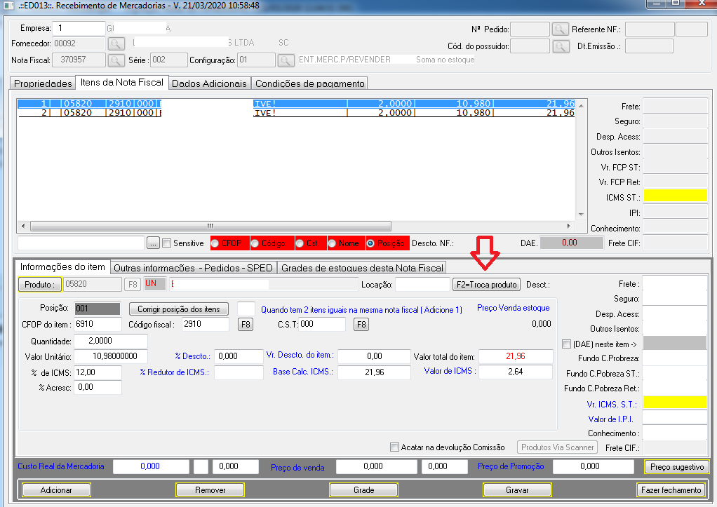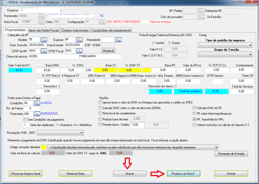 Nesta tela poderão ser feitas alterações como a data da entrada, CFOP, entre outros. Confira todos os dados e clique em gravar. Em seguida, clique em “Produtos da Nota F.”