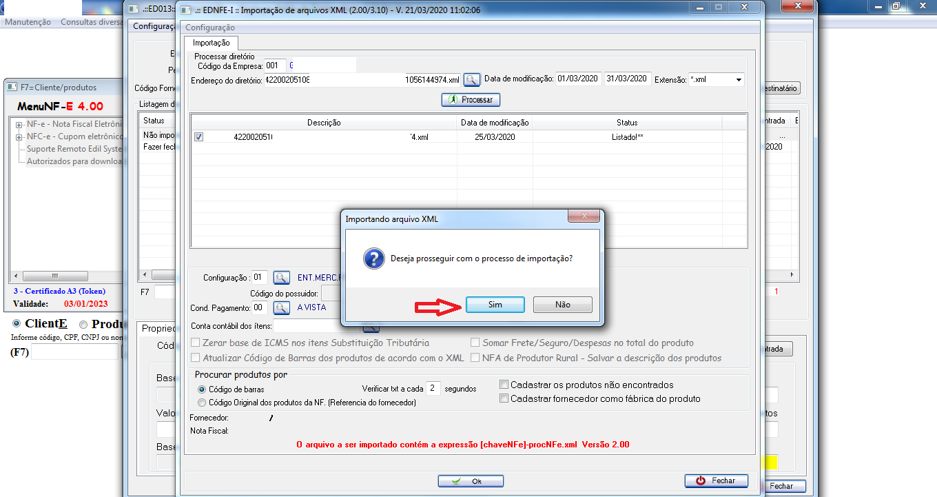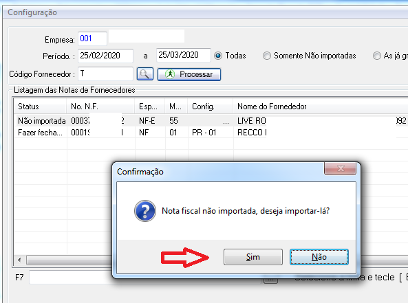 Para efetuar a entrada da nota, selecione a nota e tecle Enter. Em seguida, abrirá uma janela com a mensagem: “Nota fiscal não importada, deseja importa-lá?” Clique em Sim como indica a seta.