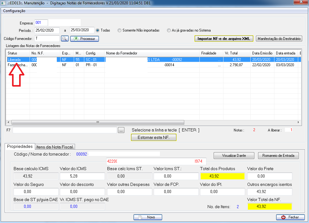 Feito isso, o fechamento da nota foi concluído, as mercadorias já foram atualizadas no estoque e o status da nota se torna Liberada/Concluída.