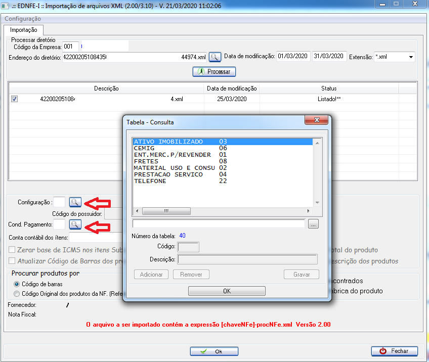 Deverá ser informada a Configuração e a Condição de Pagamento da Nota fiscal. Clicando na Lupa, são mostradas as opções de Configuração, se é mercadoria para revenda, material de uso e consumo da empresa, etc. São mostradas também as condições de pagamento, a vista, a prazo, etc.