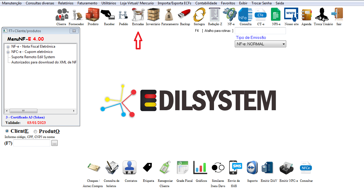 Para cadastrar uma nota fiscal de entrada clique no ícone Entradas na tela principal do Sistema.