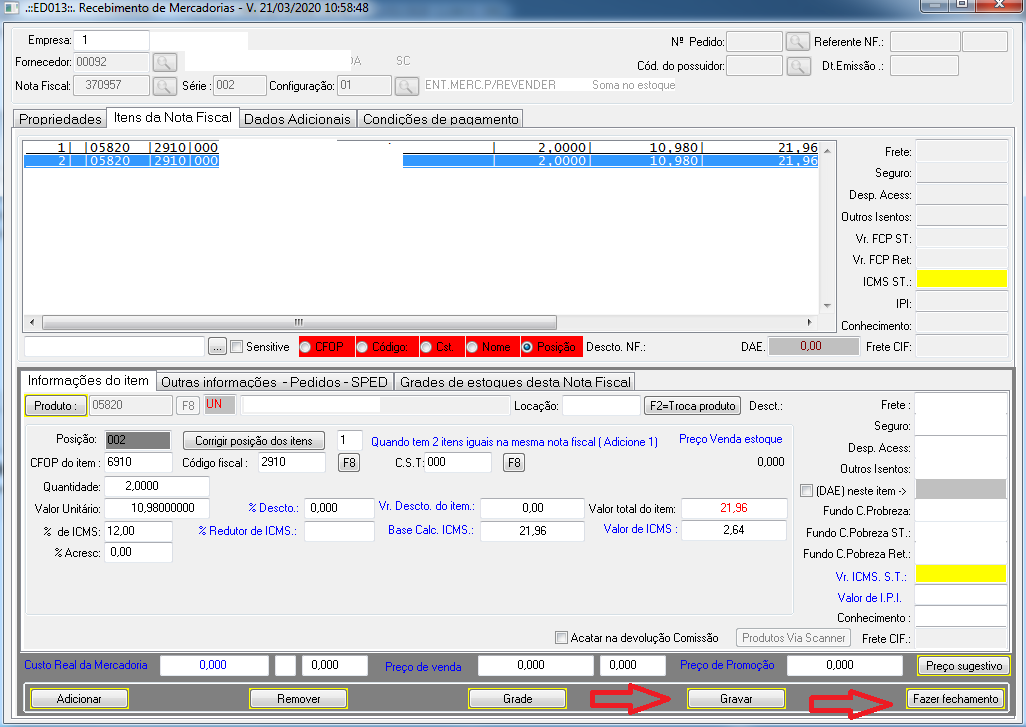 Após conferir os dados do produto, clique em gravar e clique em Fazer Fechamento.