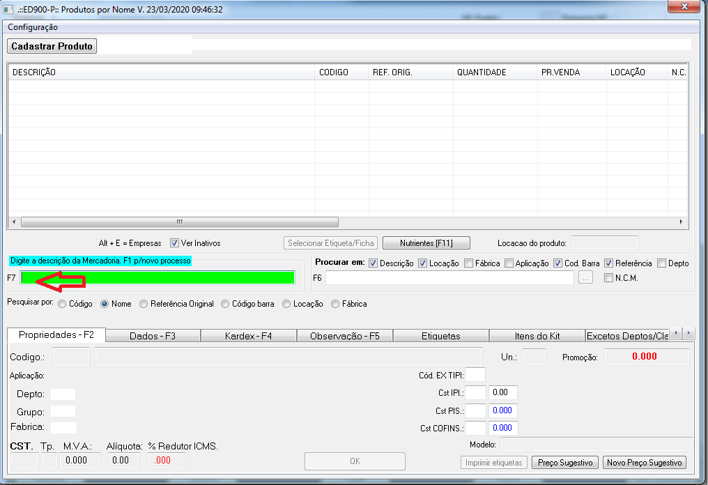 Para efetuar a pesquisa do produto digite o nome do produto no F7 ou alguma descrição que tenha no nome do produto no F6. Caso não encontre o produto clique em Cadastrar Produto.