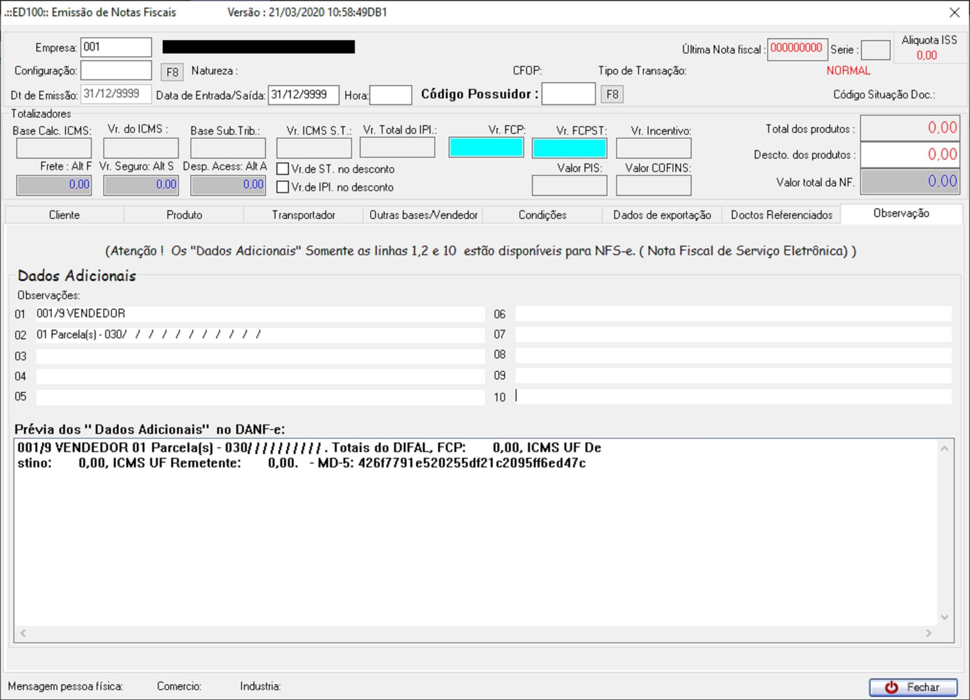 Na aba Observação altere as informações adicionais que irão constar na nota. Teclar enter até aparecer uma mensagem de confirmação na tela.