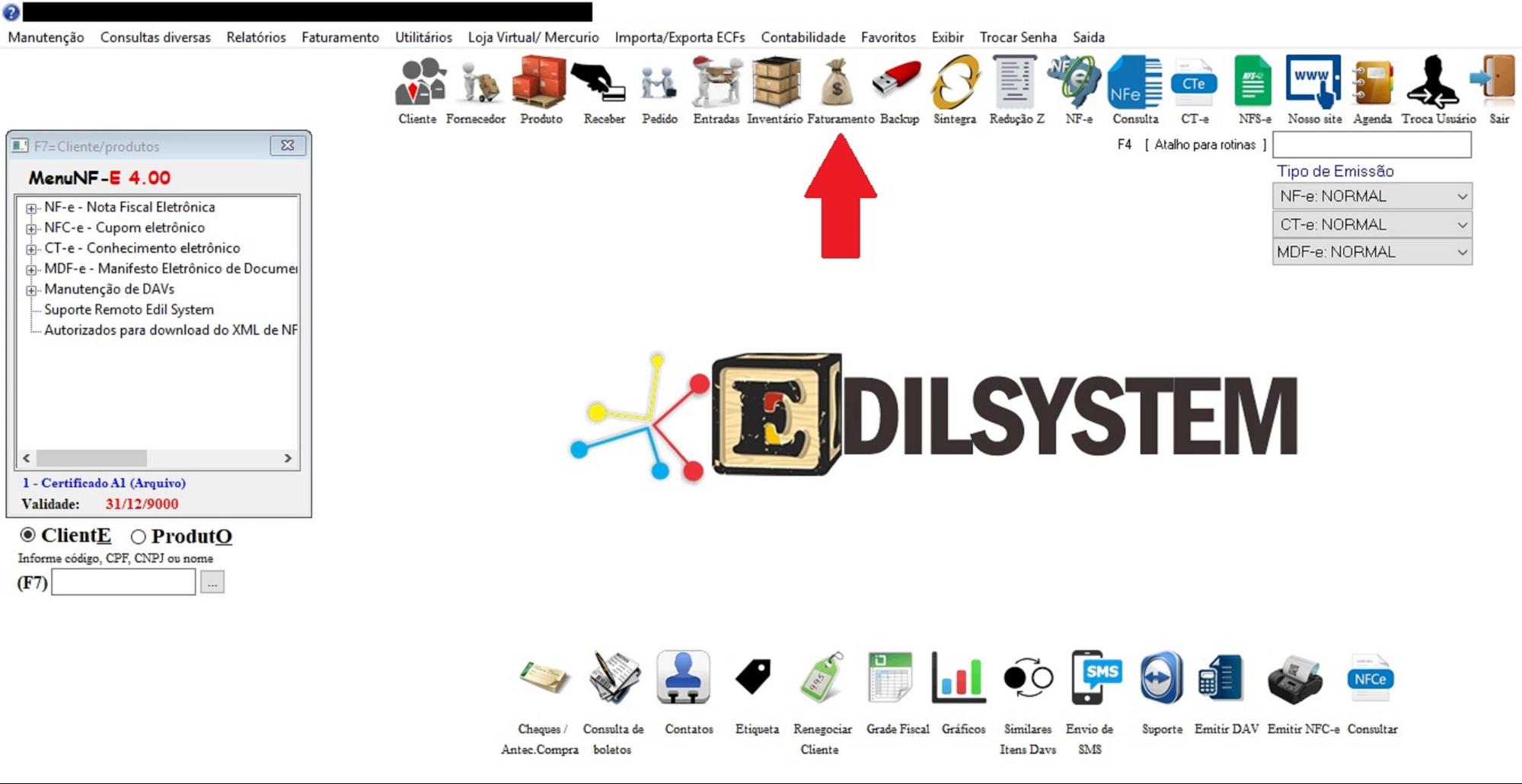 A rotina de emissão de notas fiscais pode ser acessada através do ícone Faturamento na tela inicial do programa.