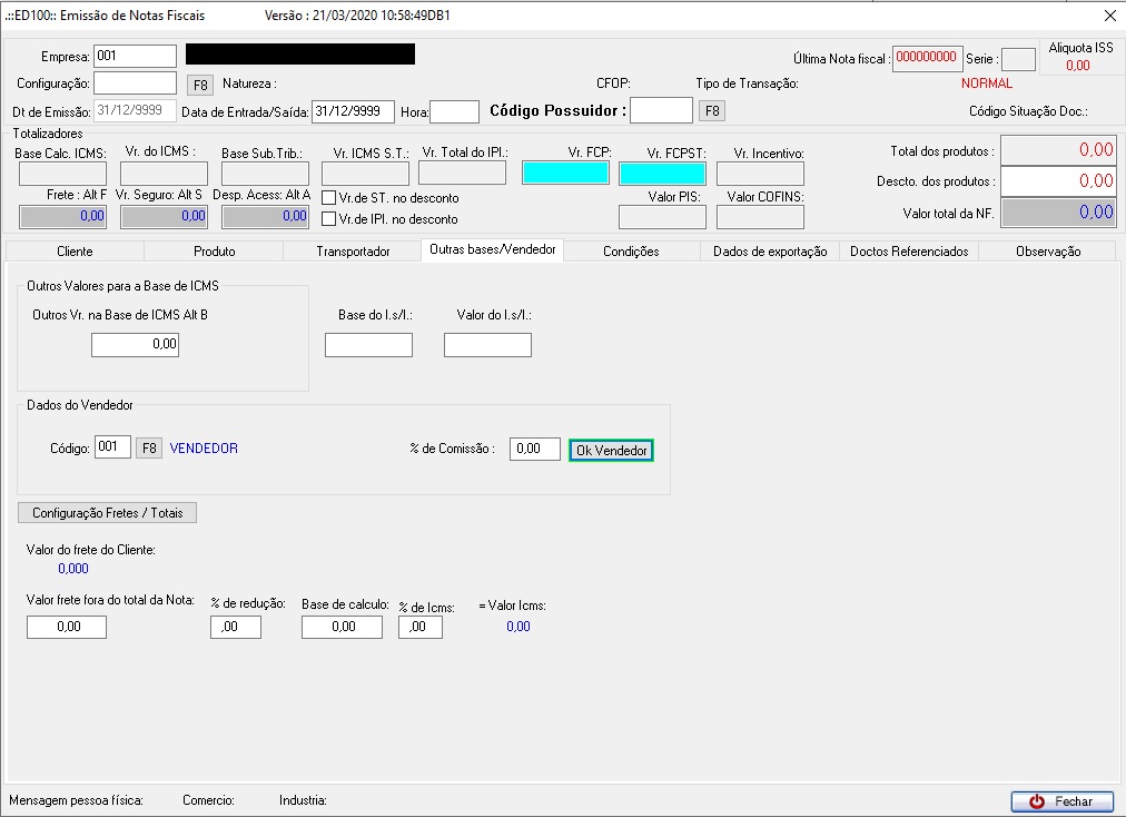 Na aba Outras bases/Vendedor, onde coloque o vendedor e a porcentagem de comissão. Depois de adicionar o código do vendedor, tecle enter até alterar a aba novamente ou clique em “Ok Vendedor”.