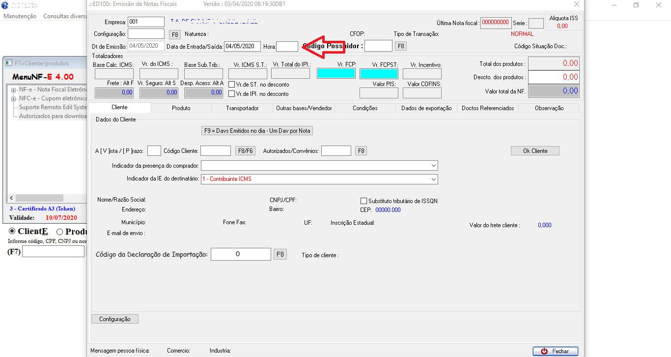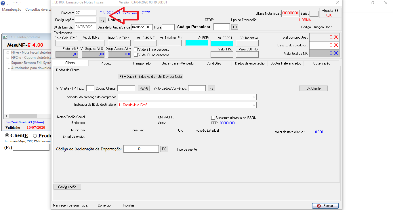 Insira o código do cliente/fornecedor, que pode ser buscado teclando F8/F6.