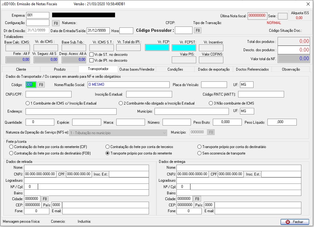 Na aba Transportador selecione quem fará o transportes destes produtos. Caso a empresa não trabalhe com transportador, digite o código 001 que irá preencher o nome “O MESMO”. Depois de adicionado o transportador, tecle enter até mudar a aba.