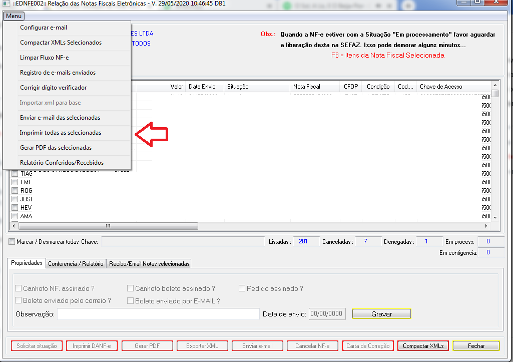 Para imprimir mais de uma nota fiscal, selecione as notas desejadas e clique em “Imprimir todas as selecionadas”. Essa opção imprime as notas sem visualização prévia na impressora padrão cadastrada.