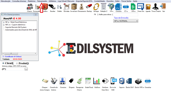 Para verificar as notas fiscais de saída ou notas fiscais canceladas, clique em “Faturamento” na tela principal do sistema.