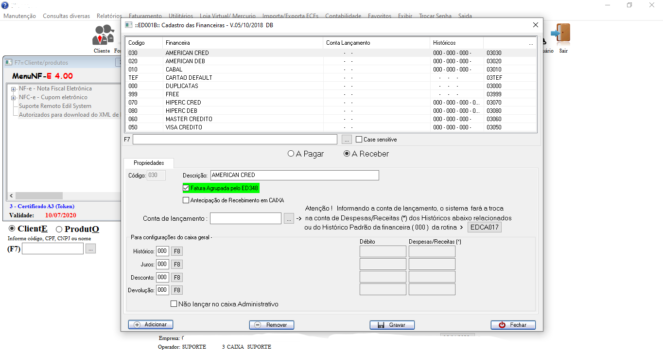 Selecione a financeira e marque a opção “Fatura agrupada pelo EDR438”. Não se esqueça de gravar!
