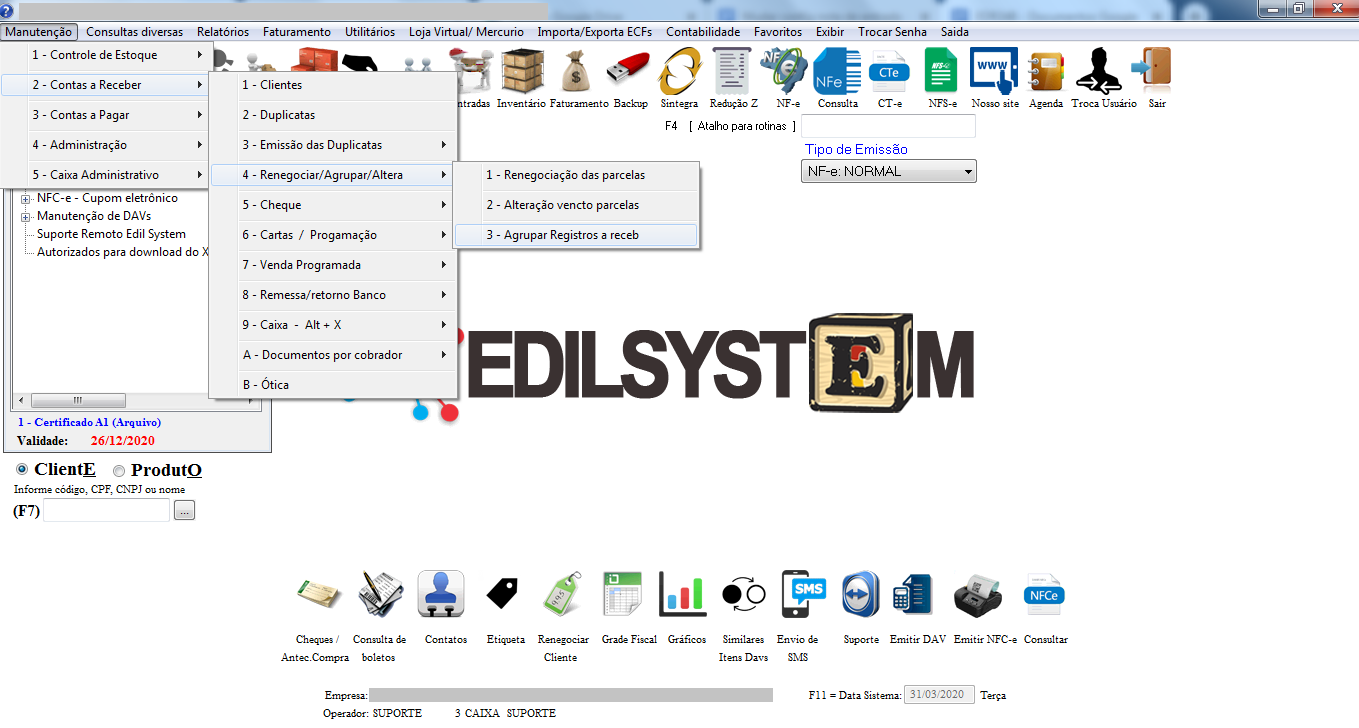 Para agrupar faturas acesse Manutenção 2 - 4 - 3 no menu superior do programa.