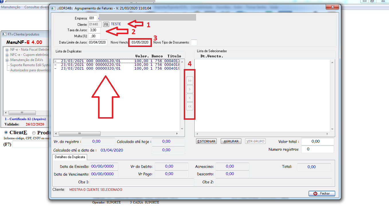 Informe o cliente (1). Caso não saiba o código, busque através do nome, documento ou endereço, teclando F8. Pode ser informada a taxa de juros a ser cobrada sobre a duplicata (2), a data limite a ser cobrado o juros, e após, a nova data de vencimento para a duplicata agrupada (3).