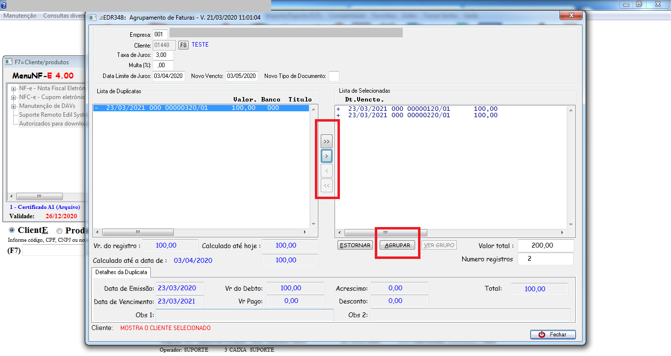 Para agrupar, a duplicata não pode conter dados bancários nem estar parcialmente quitada!
