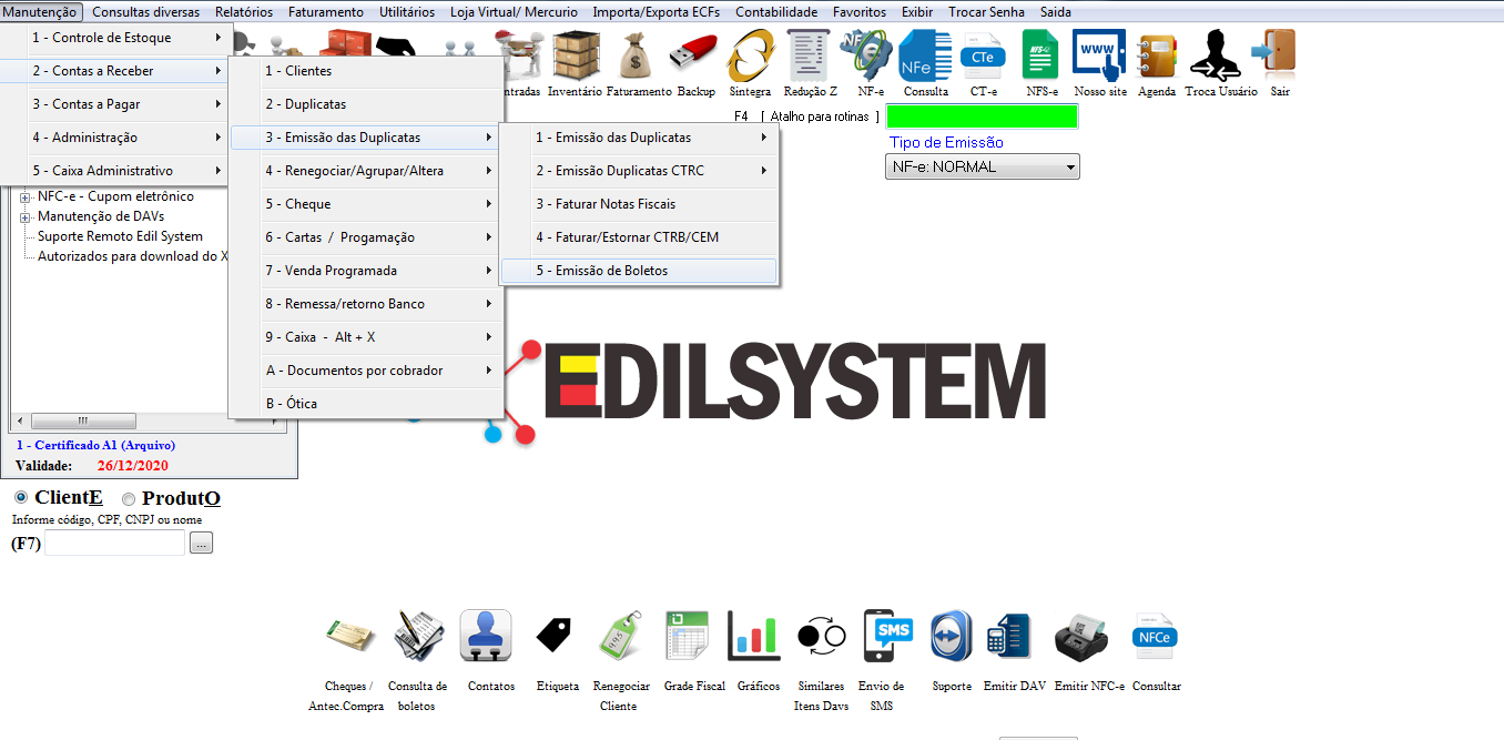 Para acessar a tela de emissão de boletos, acesse Manutenção - 2 - 3 - 5 no menu superior do programa.