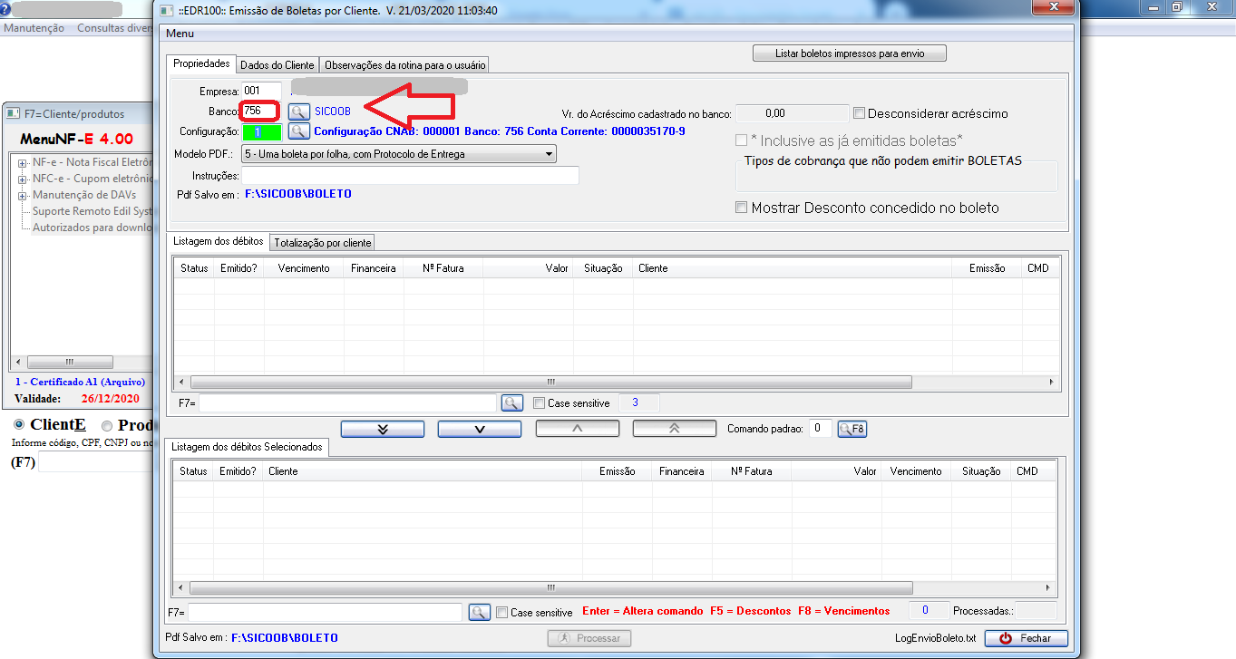Seleciona a empresa e digite o código do banco ou clique na lupa para abrir as telas de busca. As próximas opções geralmente são deixadas com os valores padrão, portanto você pode teclar enter até que o programa te leva ao campo “Cliente”.