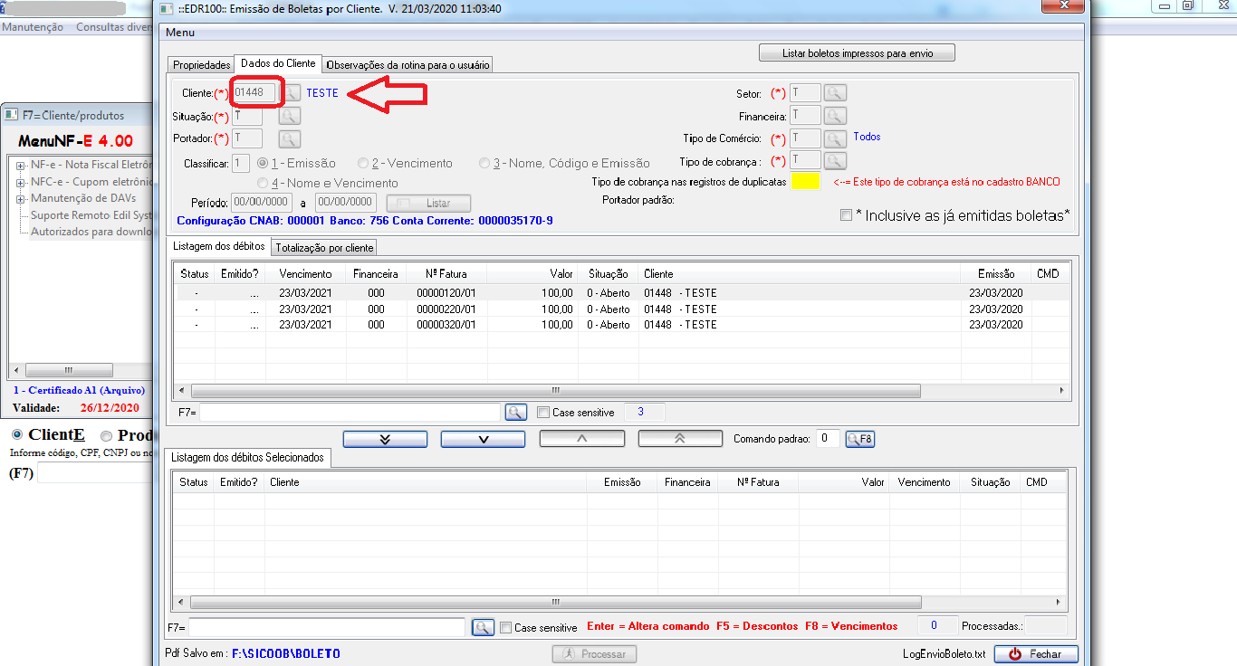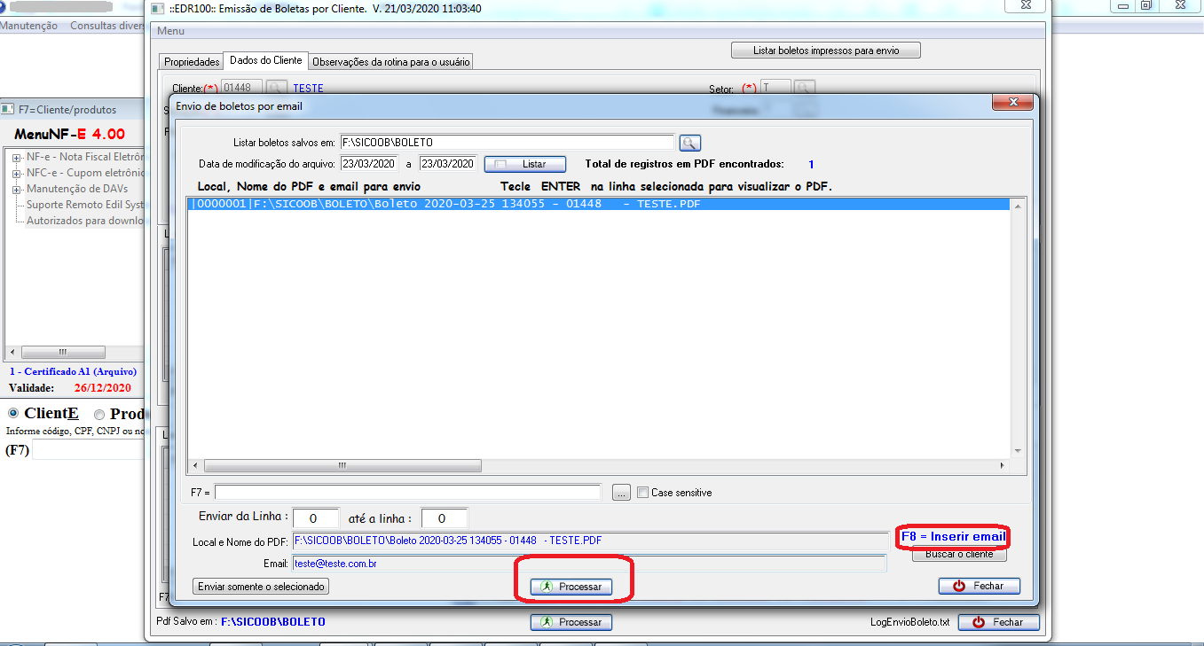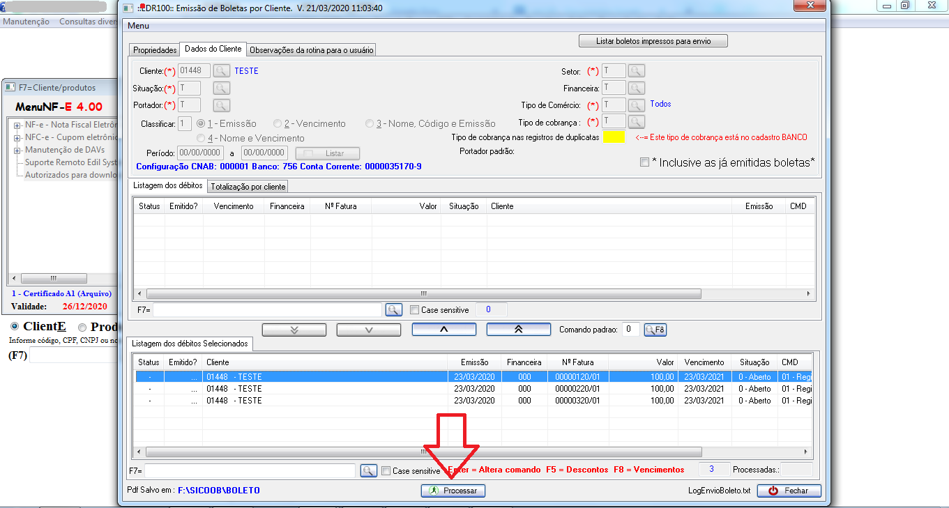 Ao processar o boleto, ele será salvo no caminho configurado no sistema. Para imprimir tecle enter sobre a linha com nome do cliente.