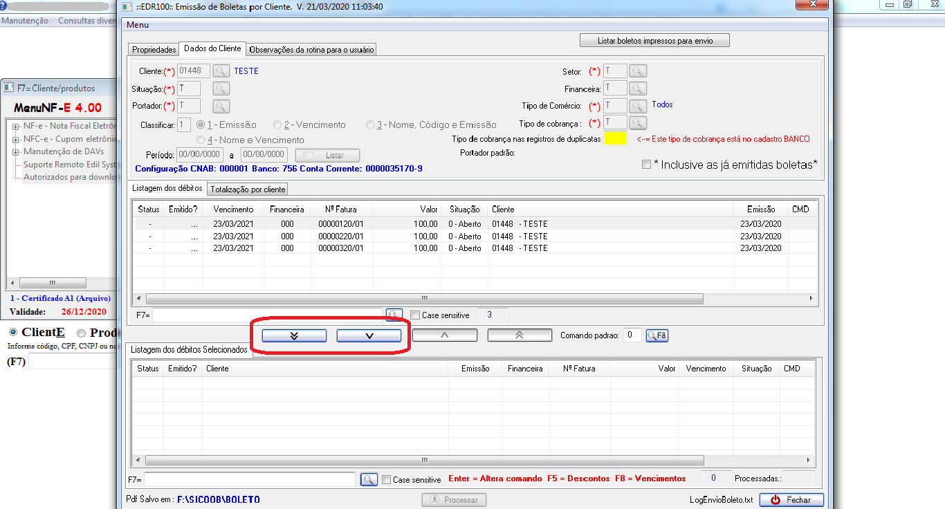 Selecione as duplicatas que irão ser geradas boletos e as encaminhe para o quadrado de baixo utilizando as setas. Caso a duplicata já tenha um boleto gerado, clique na opção “INCLUSIVE AS JÁ EMITIDAS BOLETOS” para uma possível correção de vencimento ou emissão de 2ª via.