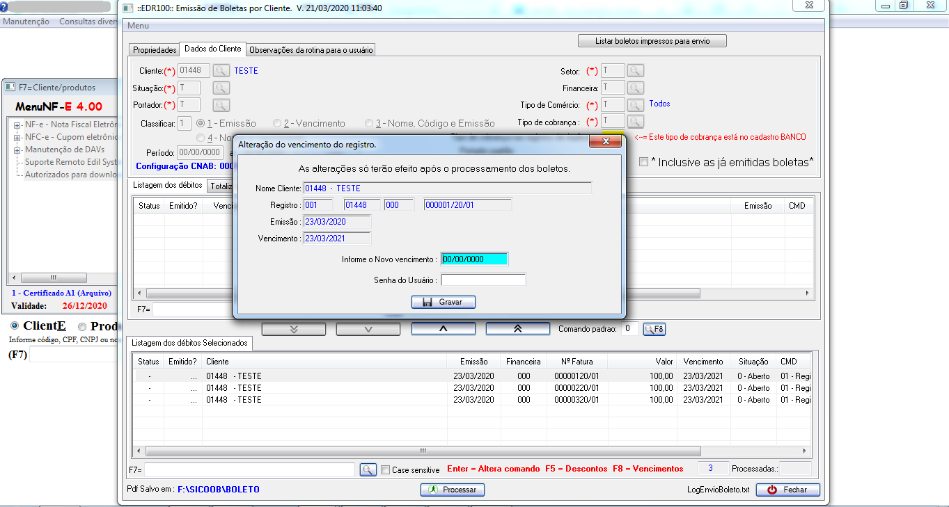 Para alterar o vencimento, as duplicatas já devem estar no campo inferior. Tecle F8, coloque a nova data de vencimento, preencha o campo com a senha do seu usuário (que foi utilizada para entrar no programa) e clique em “Gravar”.