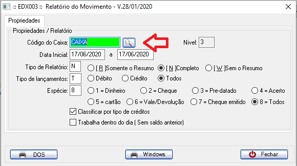 Indique o código do caixa a ser emitido o relatório. Caso não saiba o código, clique na lupa para buscar.