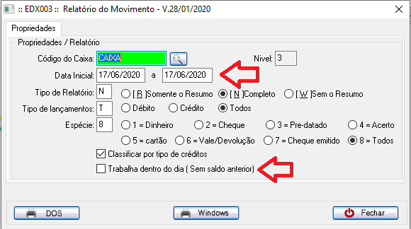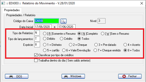 É possível especificar as informações contidas no relatório informando o tipo de lançamento (Débito ou crédito), a espécie utilizada no pagamento (Dinheiro, devolução, cartão, etc)