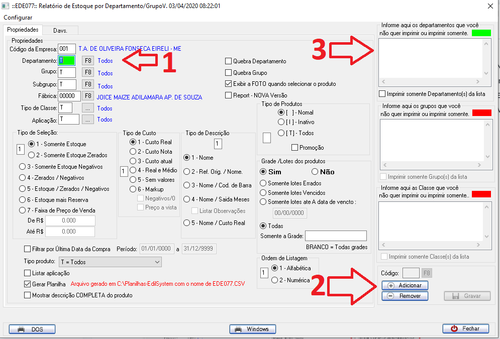 Para filtrar por departamento, confira se o campo departamento está em verde (1). Clique em adicionar e em seguida tecle F8 para escolher um departamento (2), clique em gravar e verifique se o departamento foi listado no campo do lado superior direito (3).