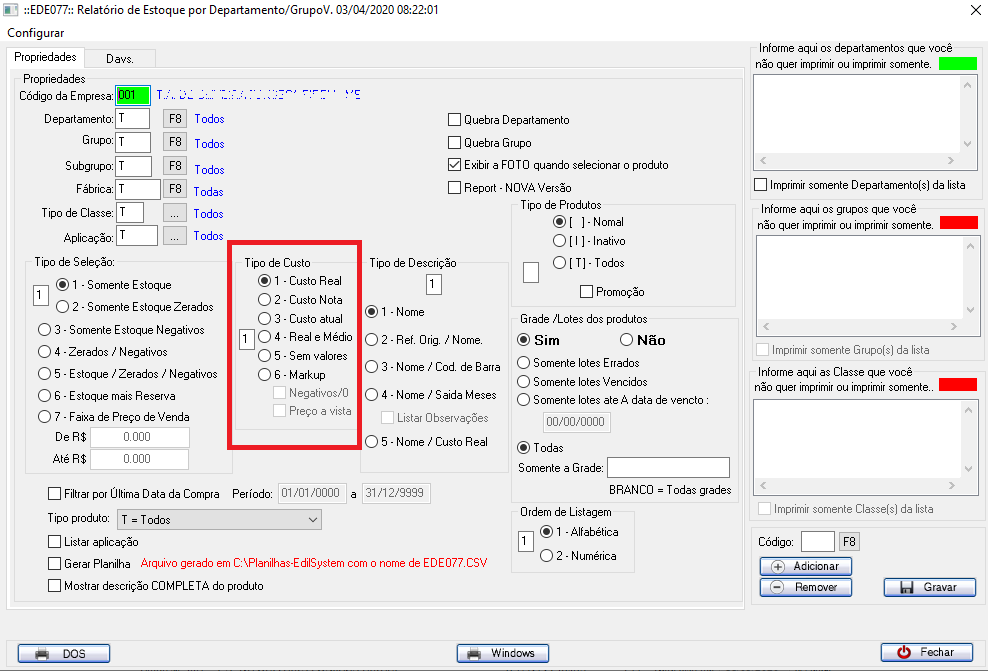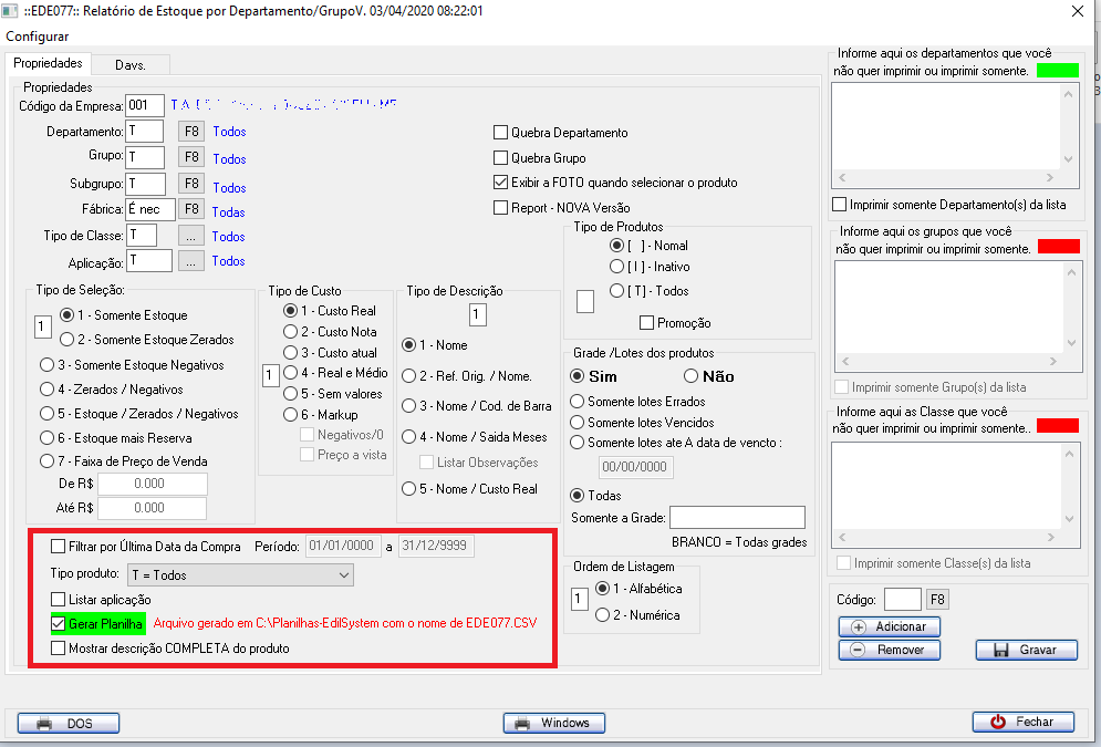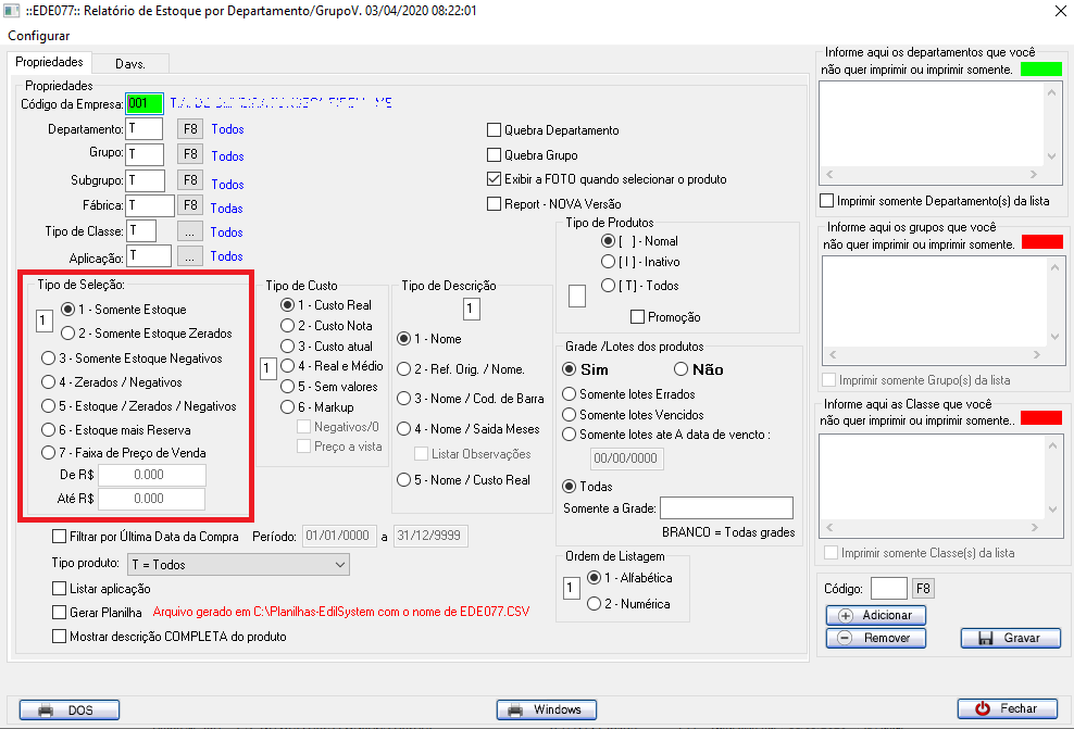 O mesmo é feito para filtrar por Grupo e Classe de produtos.