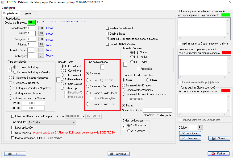 Pode ser selecionado também o tipo da descrição do produto a ser listada no relatório