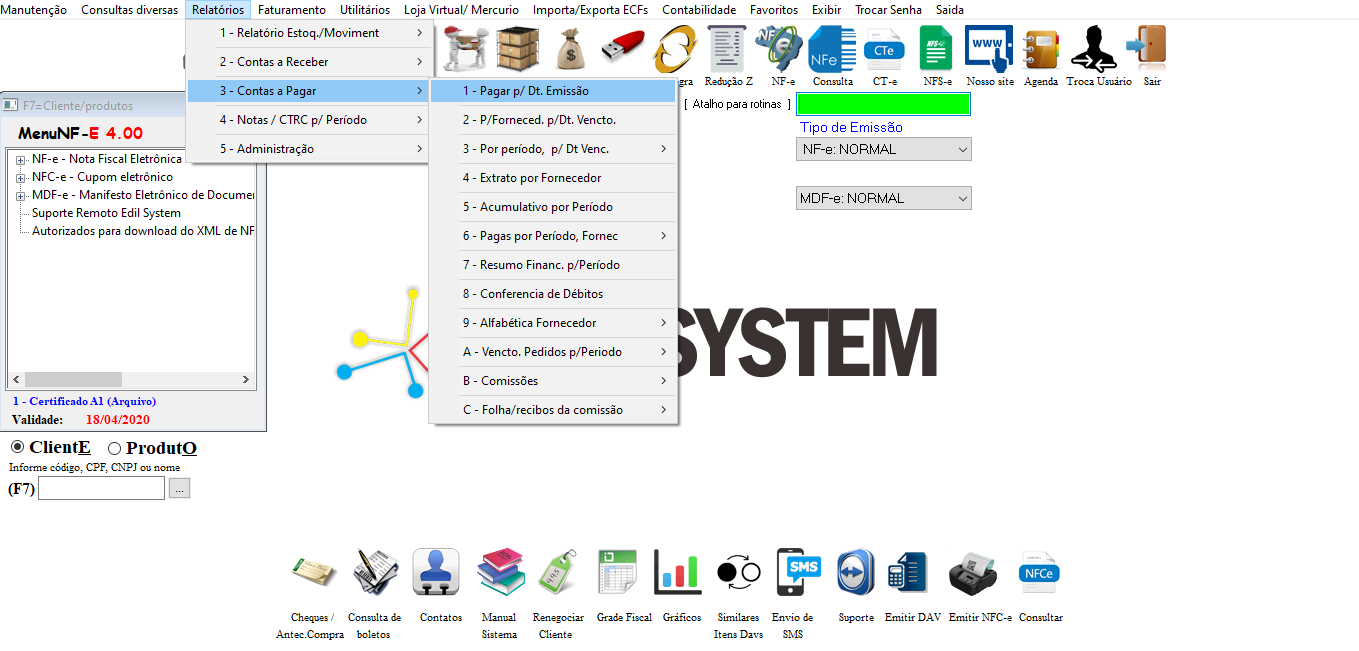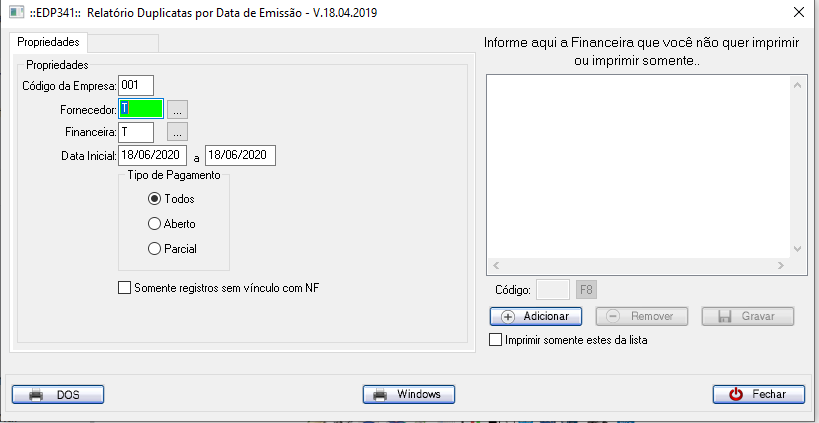 Pode ser informado um fornecedor ou fornecedor específico ou deixar T para todos. Pode ser informado também o tipo de pagamento, para listar notas com pagamento parcial, em aberto ou todas as notas.