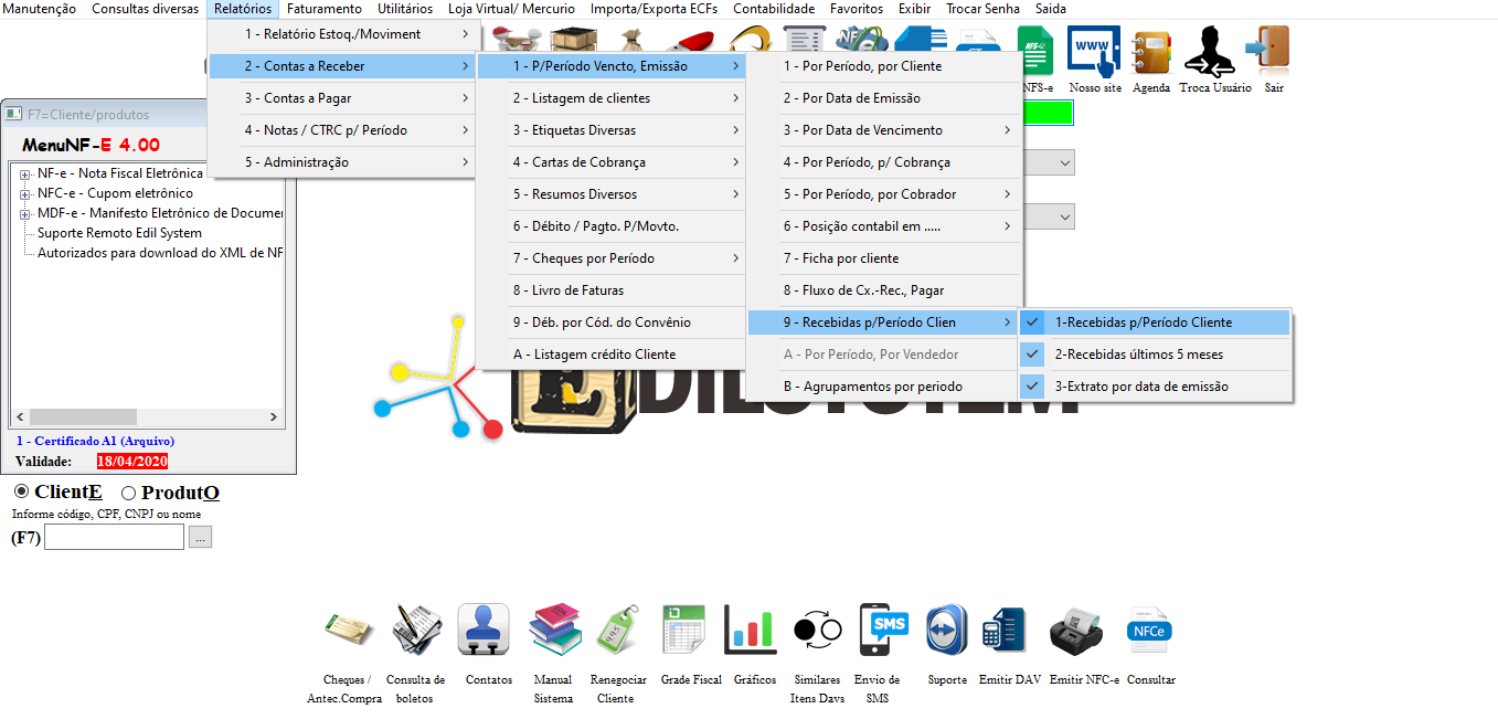 O relatório de baixa de duplicatas exibe todas as duplicatas pagas pelos clientes no período informado. Para emitir o relatório, acesse Relatórios-2-1-9-1