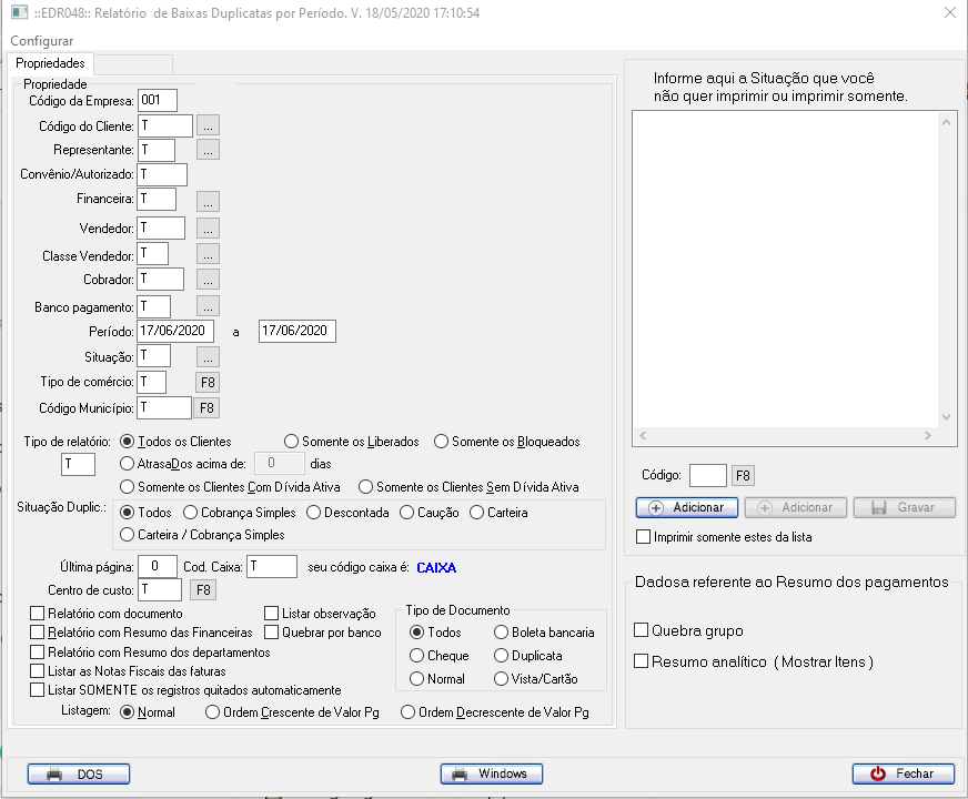 Diversos filtros podem ser aplicados ao relatório. Podem ser exibidas duplicatas de apenas um determinado vendedor, cliente, cobrador, financeira ou que se encontram em determinada situação.