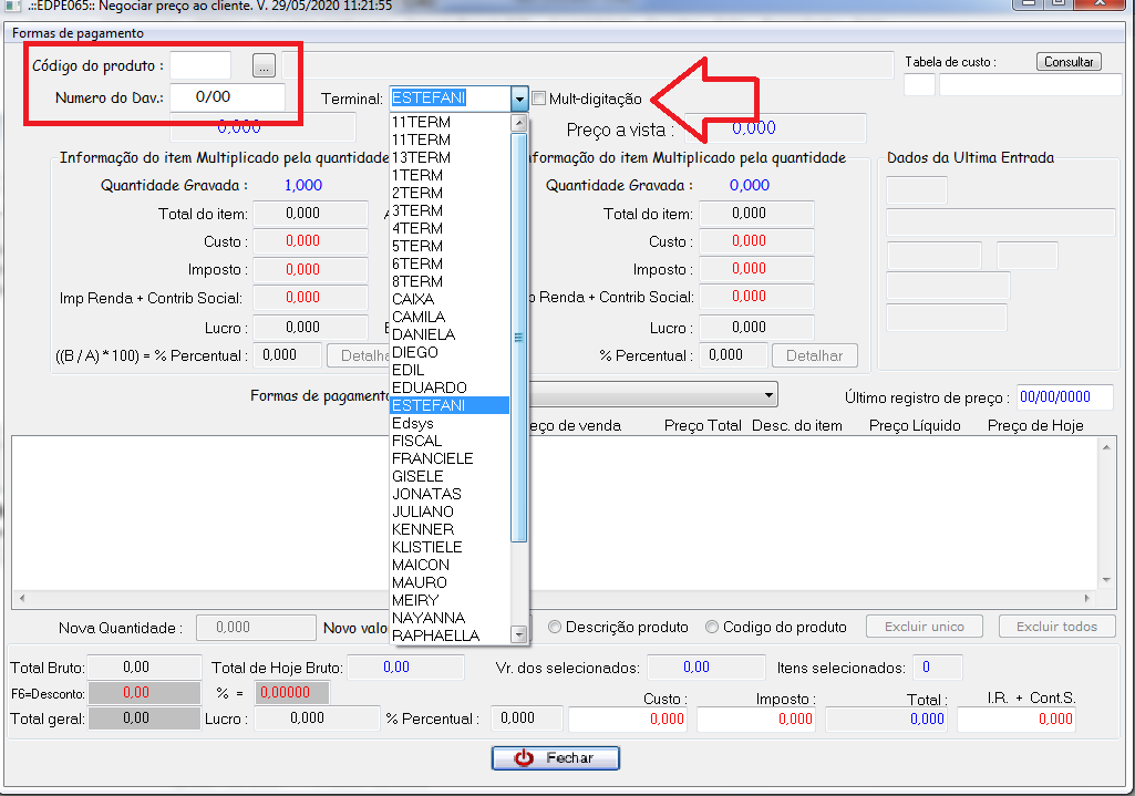 O gerente pode lançar produtos, número do Dav ou pode informar um terminal para que os produtos digitados pelo vendedor sejam listados. Assim, é possível verificar a quantidade máxima de desconto a ser dada para que não se afete o lucro da empresa.