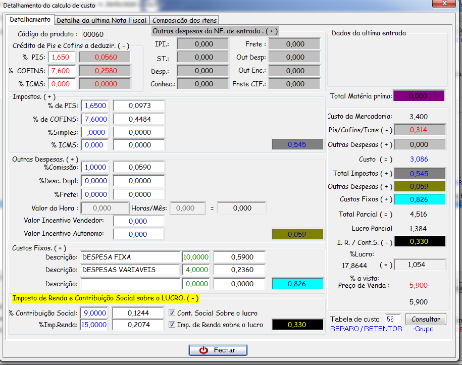 Clicando em Detalhar são exibidas com ainda mais detalhes os componentes do custo do produto. Nas abas superiores são exibidos os detalhes da ultima nota fiscal de entrada deste produto e a composição dos itens no caso de produtos que utilizam fórmula. Essas informações são apenas para consulta.