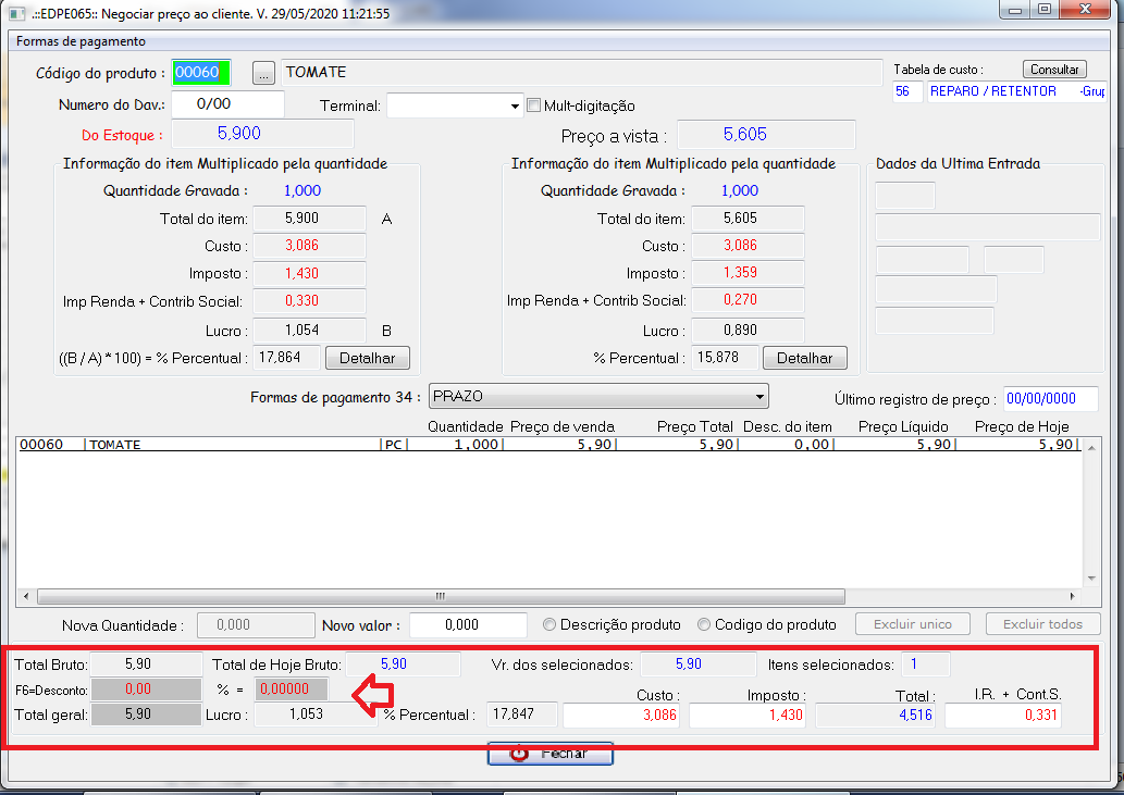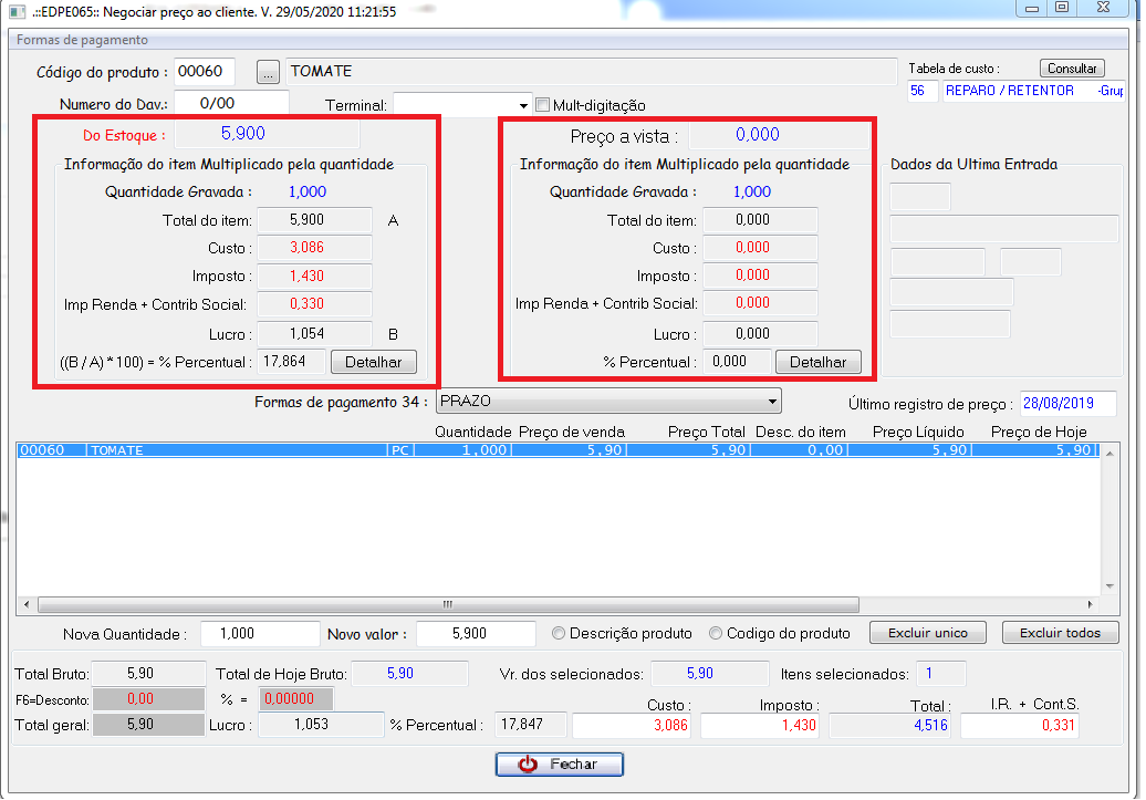 Nos campos destacados em vermelho são exibidas informações dos custos do estoque. Nos campos destacados em azul, são exibidas informações dos custos à vista. Se na grade não há % de desconto à vista, não são exibidos os valores.